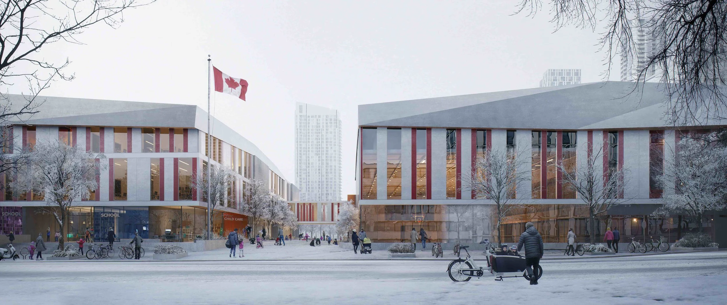 The Toronto District School Board, Toronto Catholic District School Board, and City of Toronto & Childcare Services will be establishing new facilities inside the complex. Photo courtesy of ZAS Architects.